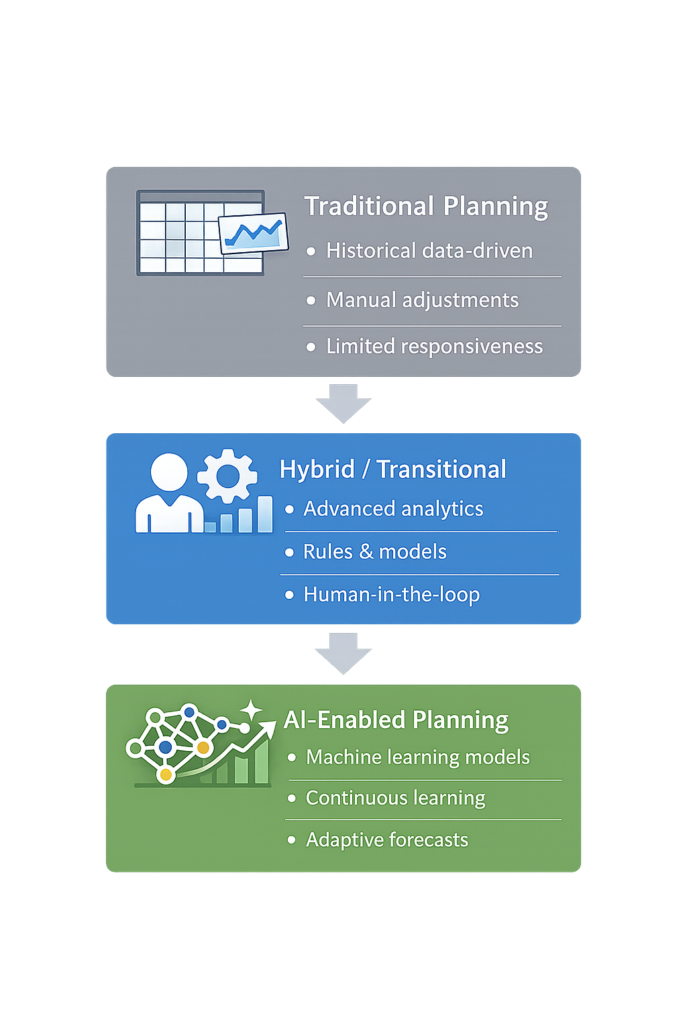 Most organizations start by identifying high-impact use cases, ensuring data readiness, and gradually integrating AI alongside existing planning processes rather than replacing them all at once.